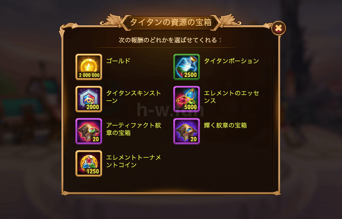 アイテムガイド 操作 インベントリ>消耗品>アイテムをクリック後、使用>以下の画面で模様を決定し、使用を押す 選べる報酬 タイタンの強化素材を選ぶことができます。 このアイテムが手に入るイベント 関連記事 ヒーローの資源