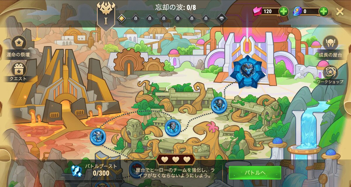 - 屋台でチームを集めて強化しよう。章によっては、開始時にヒーローやタイタンが加わることもある。