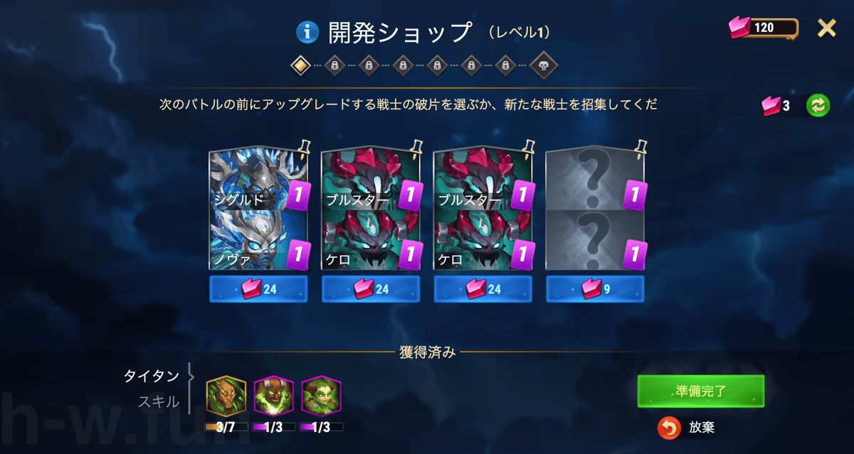 - いつでも屋台に戻って、ヒーローやタイタンを追加で購入できる。