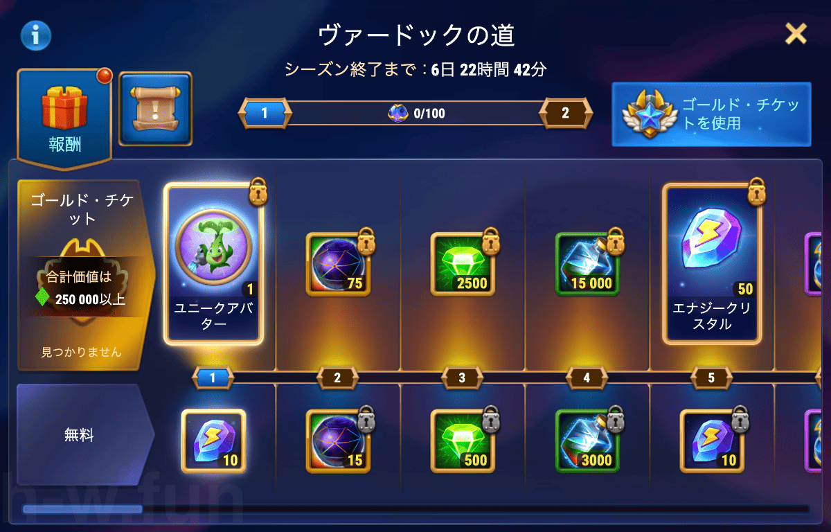 | 2 | ボス2 (ヒーロー) | スキンストーンの大型宝箱 x30 ヴァラーコイン x20,000 サファイアのメダリオン x2 | ||