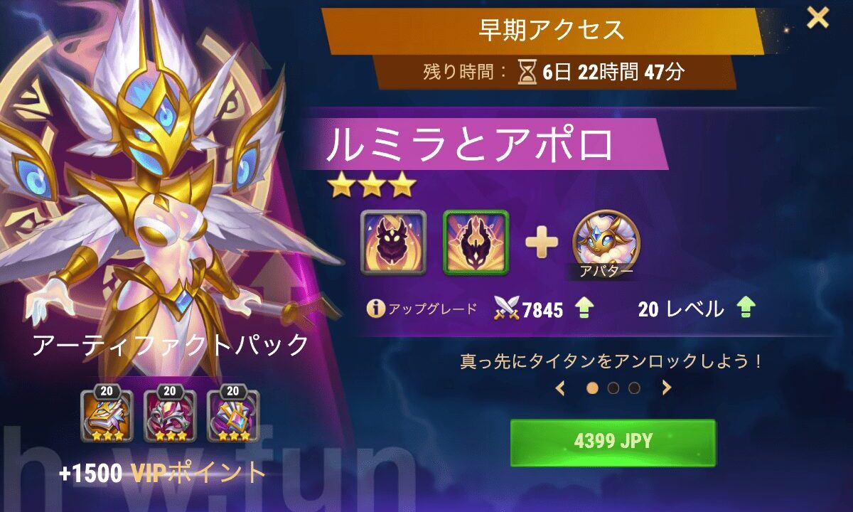 - タイタンの召喚、指定されたレベルまでの経験値、アーティファクト、限定アバターがパッケージされている
