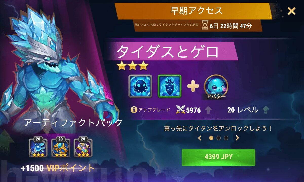 - タイタンの召喚、指定されたレベルまでの経験値、アーティファクト、限定アバターがパッケージされている