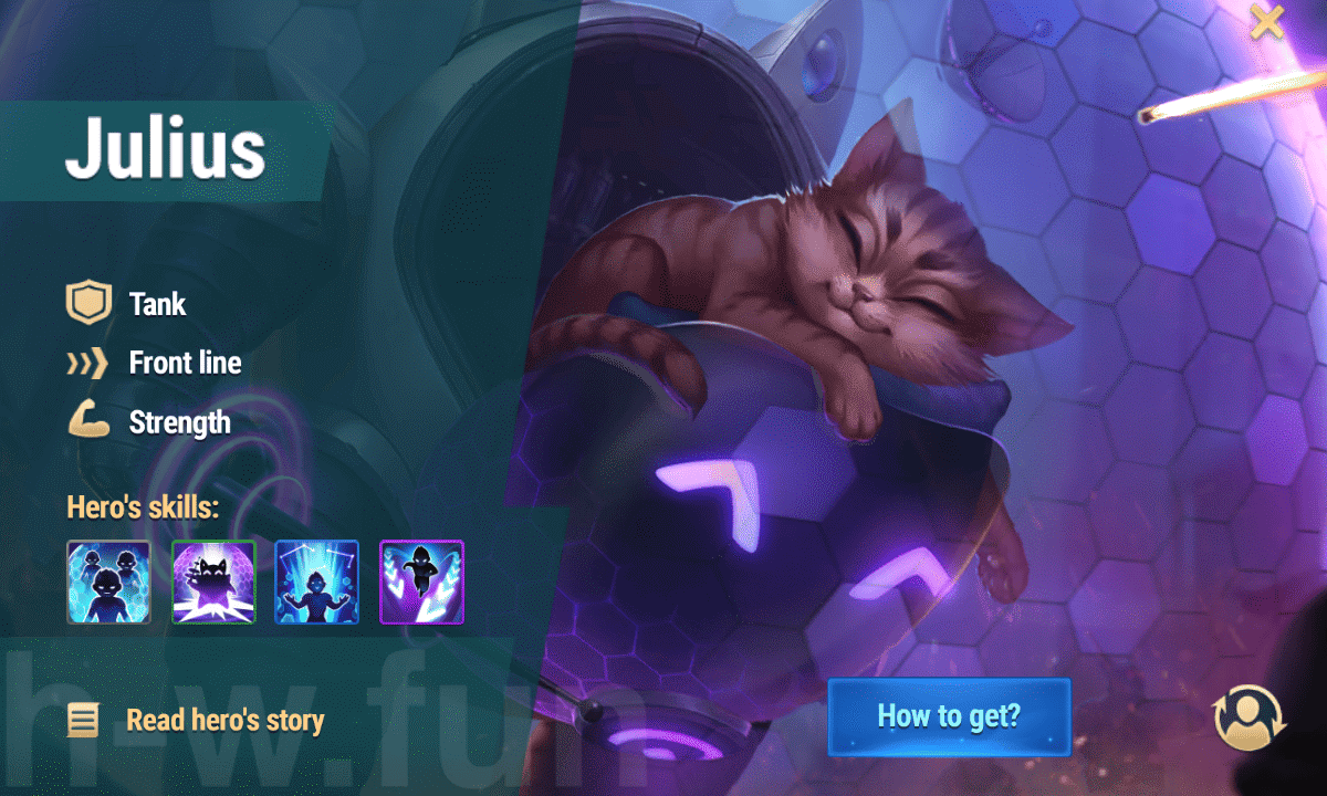 - Julius surrounds his team with a defense matrix that absorbs all damage. After the matrix is destroyed, all heroes in the team are healed.