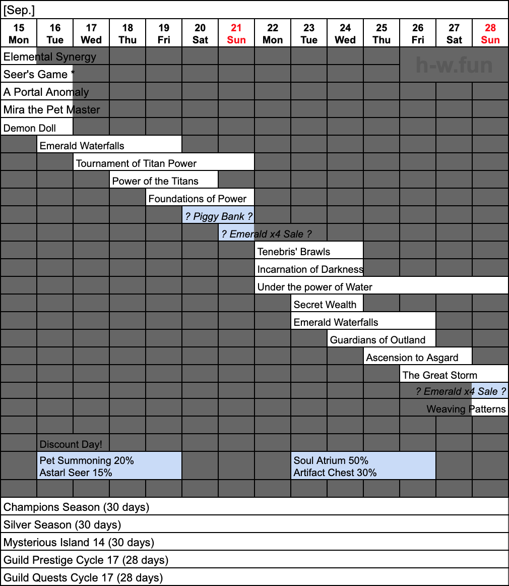 - Sun. Sep. 14 – Wed. Sep. 17: Seer’s Game