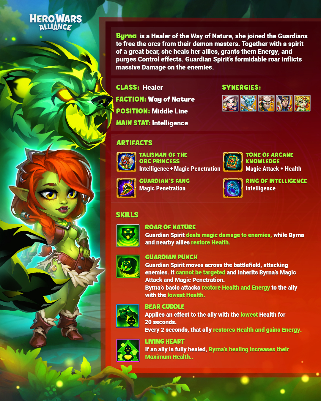 - Byrna, a new healer who increases Max Health, has arrived. She is a unique hero — an Orc princess who commands the ancestral spirits of bears.