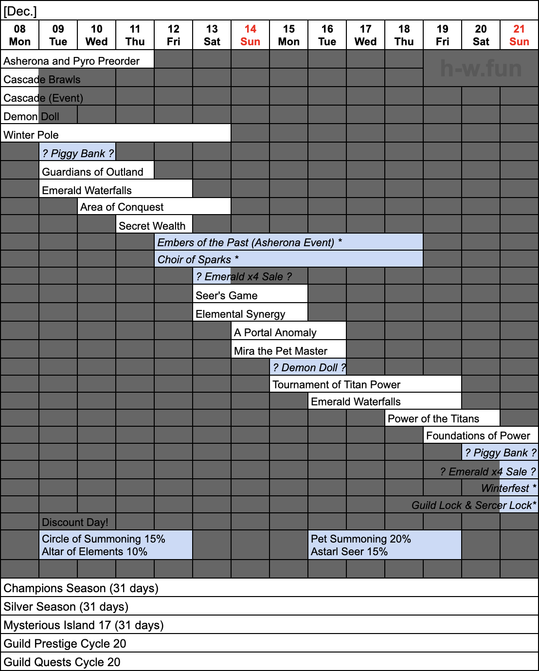 - Thu. Dec. 25 – Thu. Jan. 22: Guild Quests Cycle 21