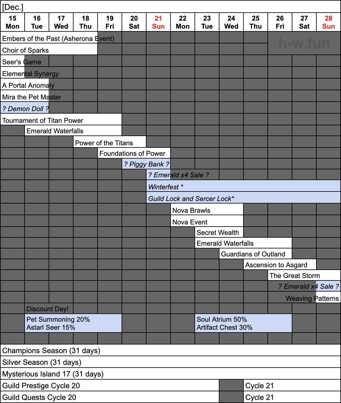- Thu. Dec. 25 – Thu. Jan. 22: Guild Quests Cycle 21