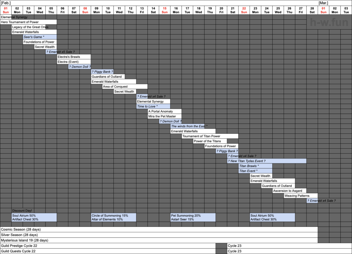 - Sat. Feb. 21 – Sat. Mar. 21: Guild Quests Cycle 23