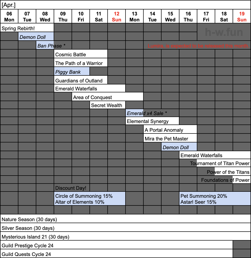 - Wed. Apr. 01 – Fri. May. 01: Nature Season (30 days)