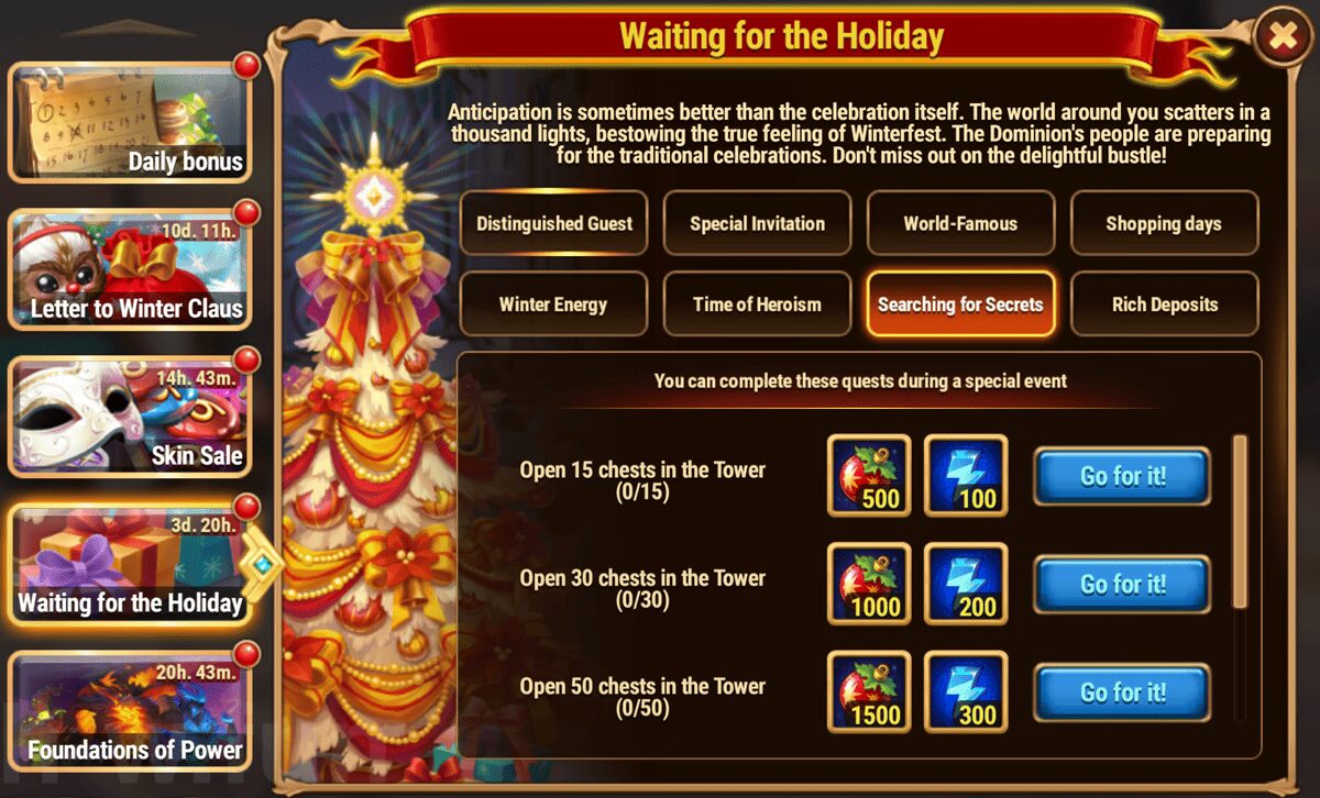 | Open chests in Tower (15) | 500 Winterfest Bauble (Total 500) 100 Energy (Total 100) | 250 (x17) |