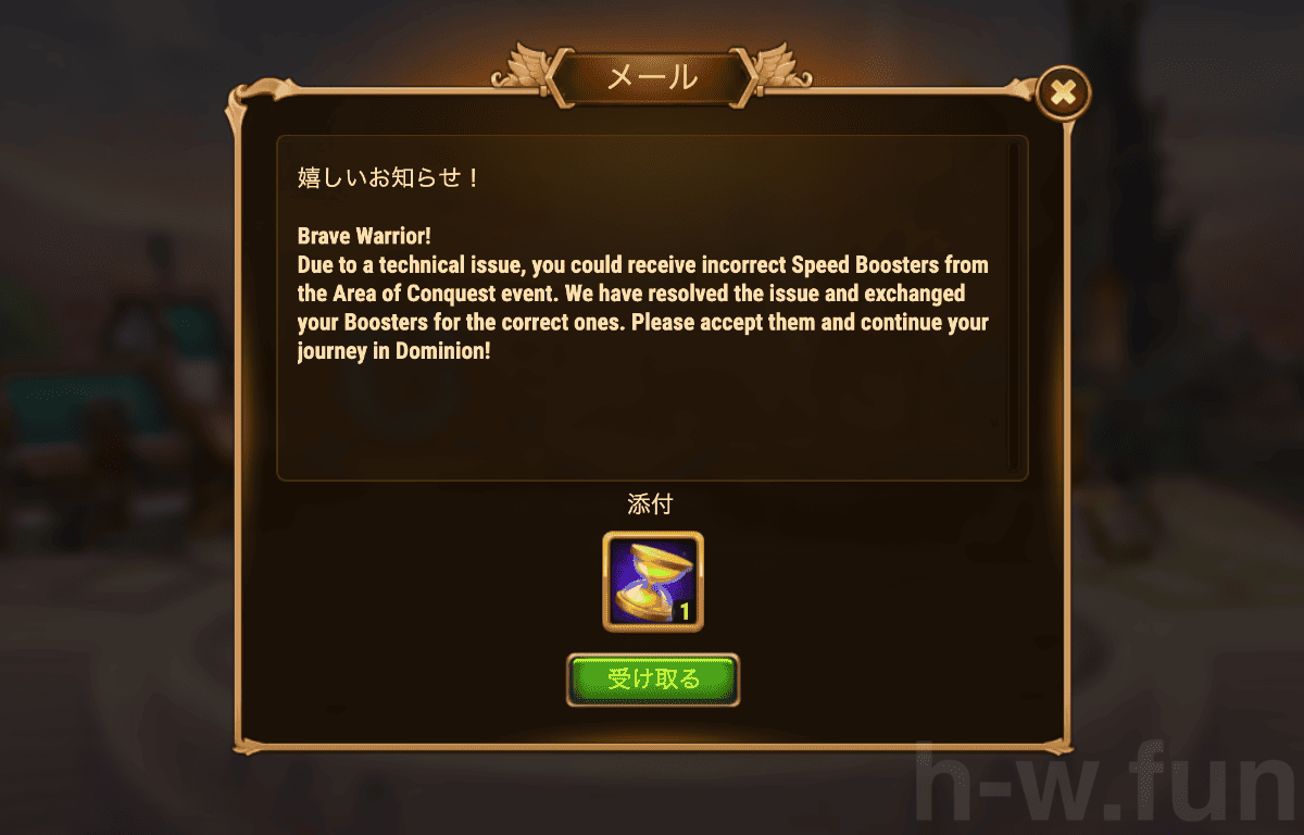 - Due to a technical issue, you could receive incorrect Speed Boosters from the Area of Conquest event. We have resolved the issue and exchanged your Boosters for the correct ones. Please accept them and continue your journey in Dominion!