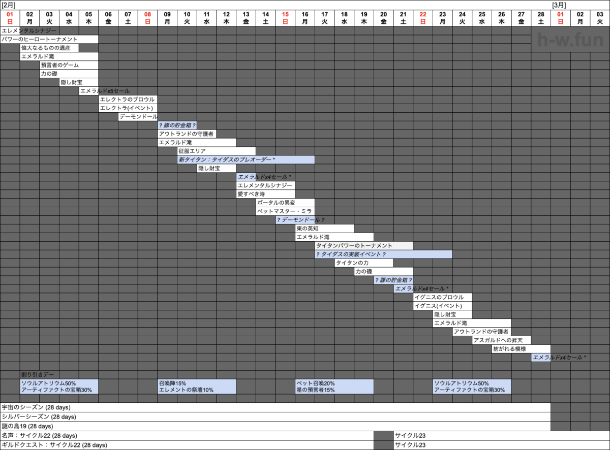- 02/01(日) 〜 03/01(日): シルバーシーズン (28 days)