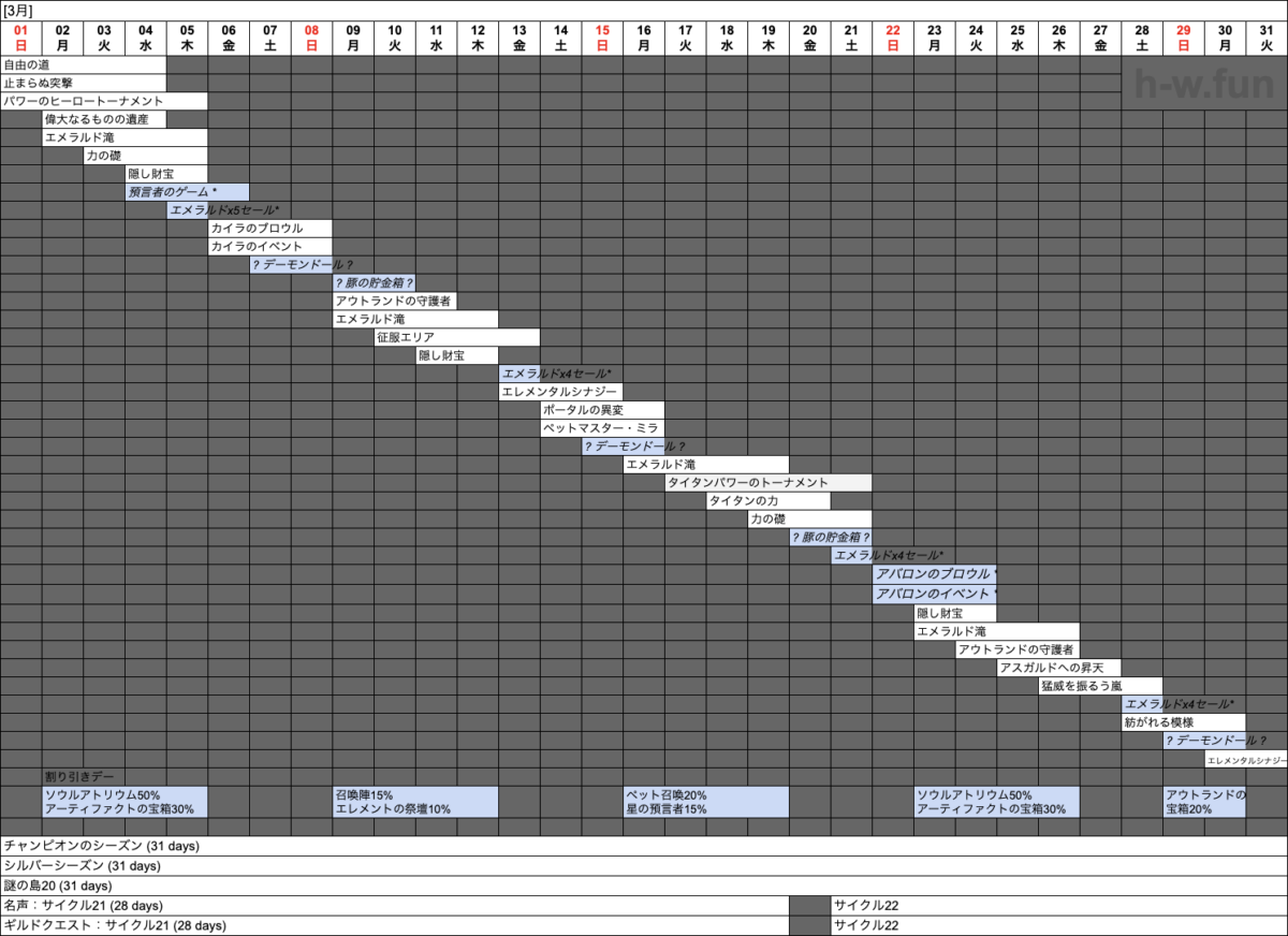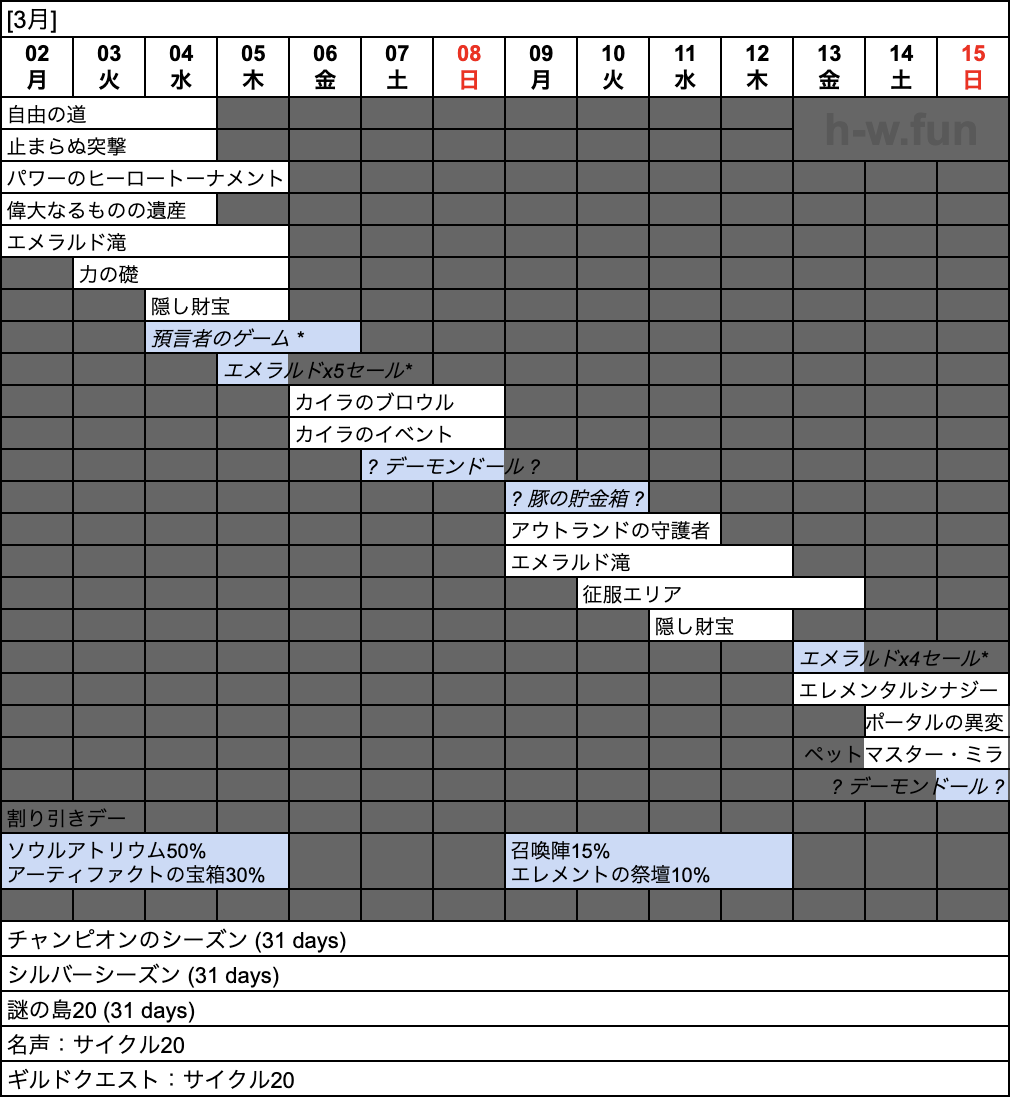 - 03/01(日) 〜 04/01(水): チャンピオンのシーズン (31 days)