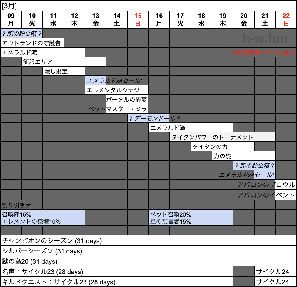 - 03/01(日) 〜 04/01(水): チャンピオンのシーズン (31 days)