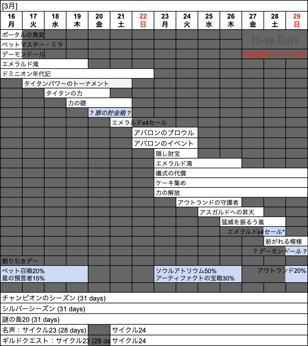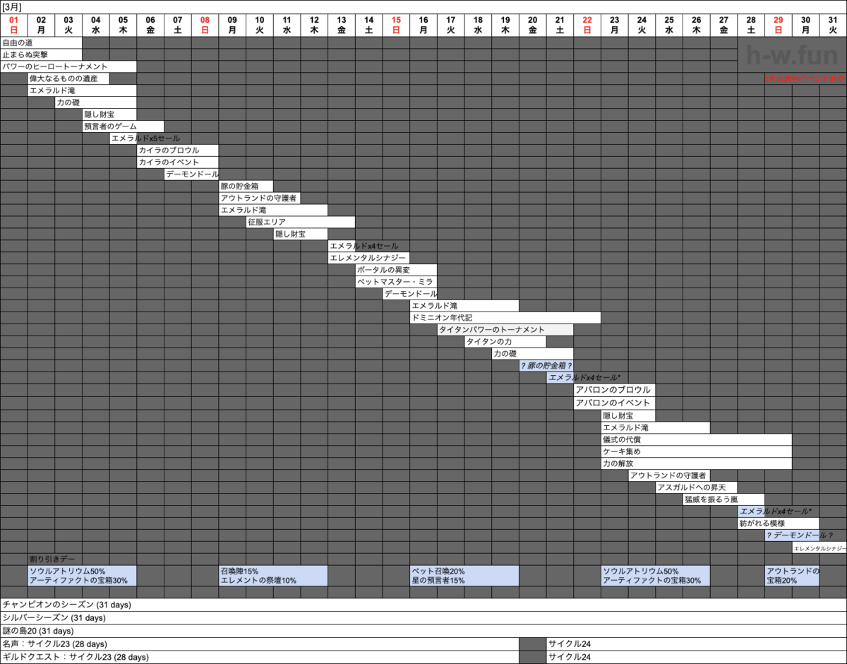 - 03/01(日) 〜 04/01(水): チャンピオンのシーズン (31 days)