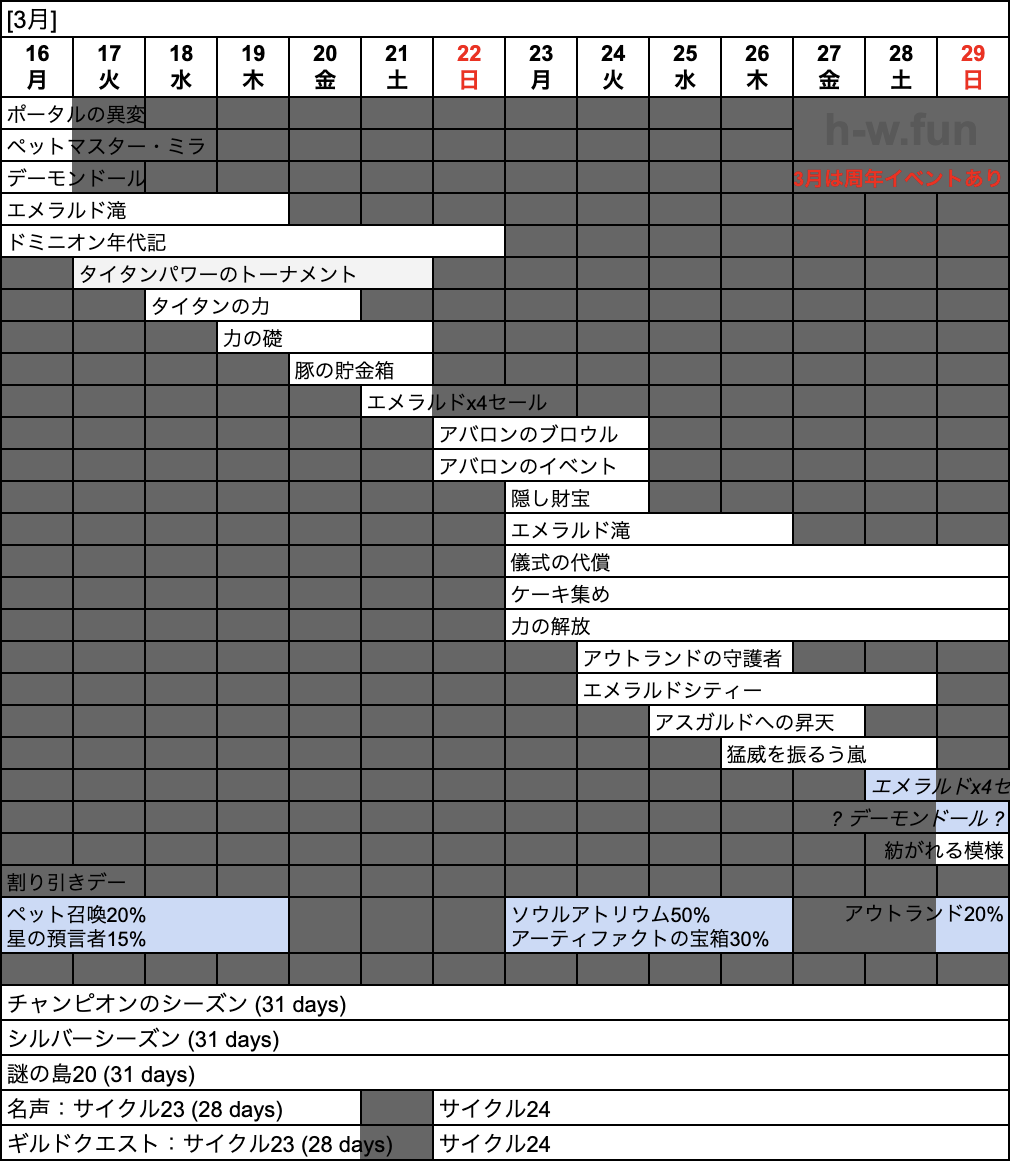 - 03/01(日) 〜 04/01(水): チャンピオンのシーズン (31 days)