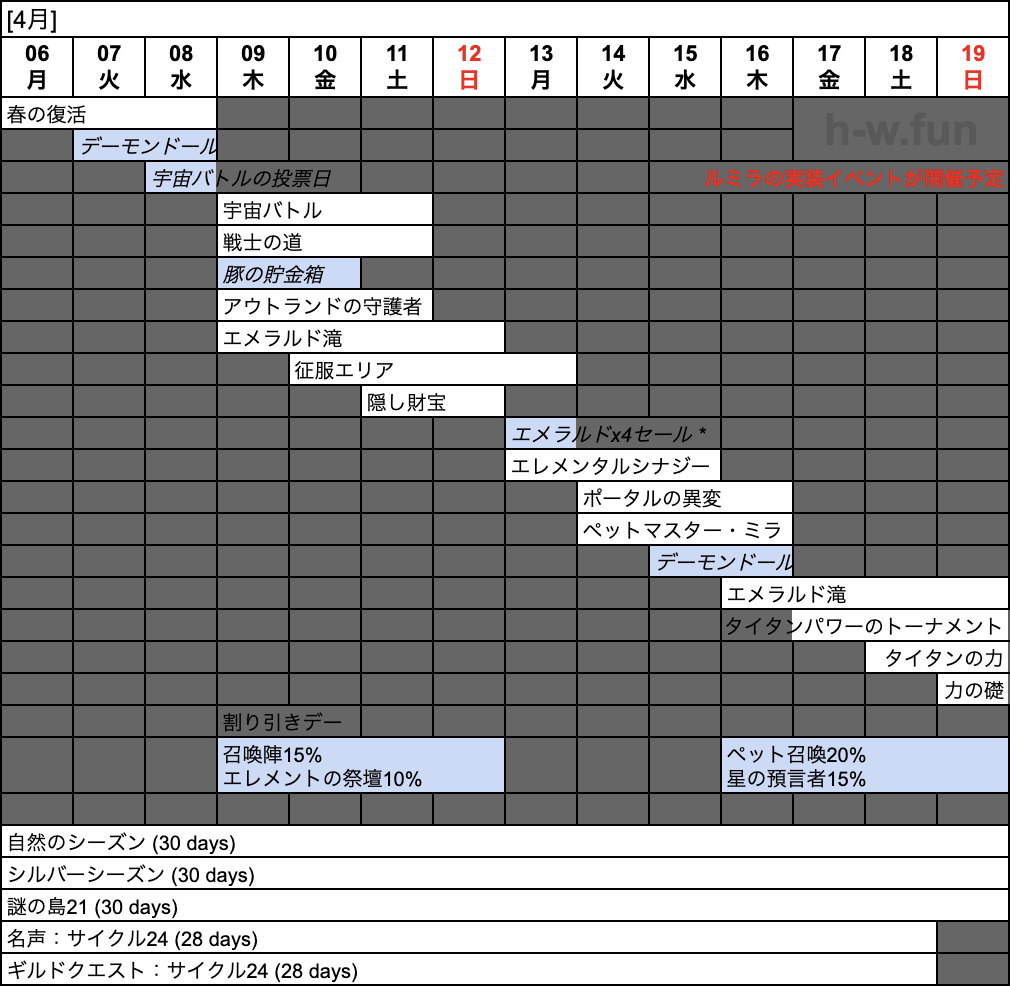 - 04/13(月) 〜 04/16(木):エレメンタルシナジー ( > ラッキーロード)